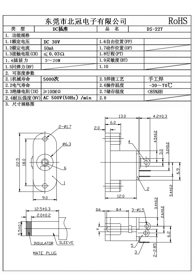 Typical Specifications 1. Rating : DC 30V 0.5A 2. Contact Resistance : 70ΩMax 3.Lnsulation Resistance: DC500V 1Minute 4.Operating Temperature Range: -25℃+80℃ 5.Ambient Humidity Used: ≤85%RH 6. Operating Force : 3-20N 7. Operating Life : 5,000Cycles
