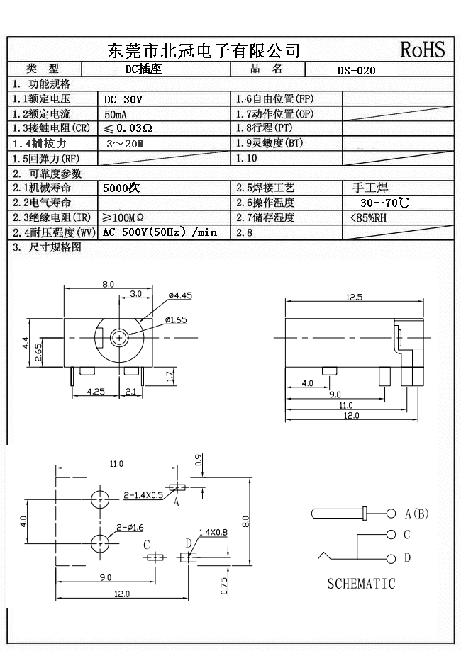 Typical Specifications 1. Rating : DC 30V 0.5A 2. Contact Resistance : 70ΩMax 3.Lnsulation Resistance: DC500V 1Minute 4.Operating Temperature Range: -25℃+80℃ 5.Ambient Humidity Used: ≤85%RH 6. Operating Force : 3-20N 7. Operating Life : 5,000Cycles