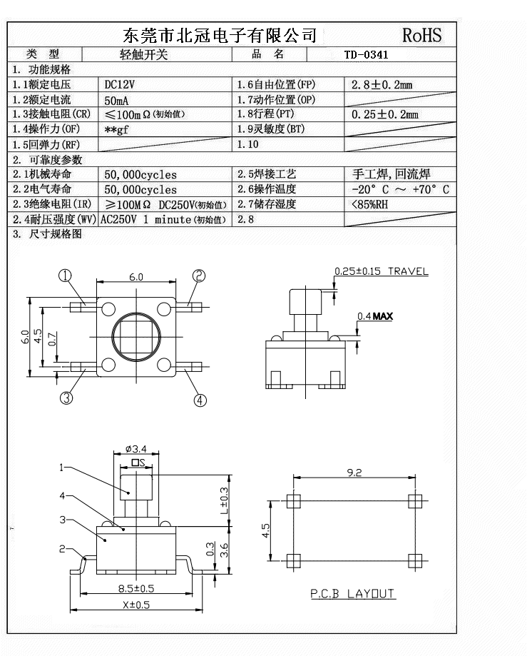Typical Specifications 1.Rating : DC 12V 50mA 2.Contact Resistance: ≤100mΩ 3.Lnsulation Resistance: ≥100mΩ DC250V 4.Operating Temperature Range: -25℃+80℃ 5.Ambient Humidity Used: ≤85%RH 6.Operating Force : 180gf,250gf 7.Travel:0.25±0.1mm 8.Life : 100,000 Cycles