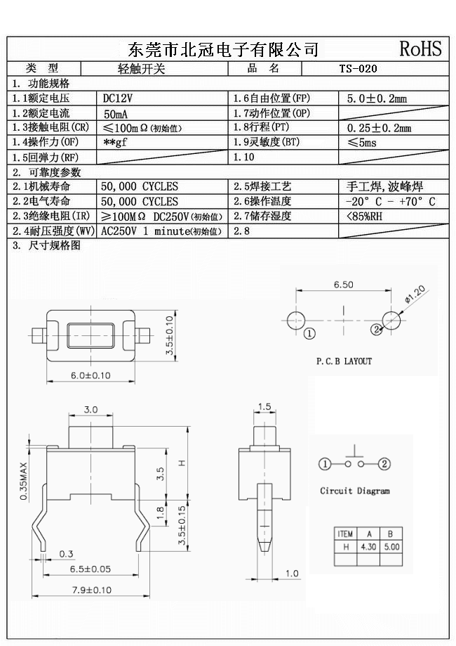 產(chǎn)品名稱:TS-020輕觸開關(guān)
