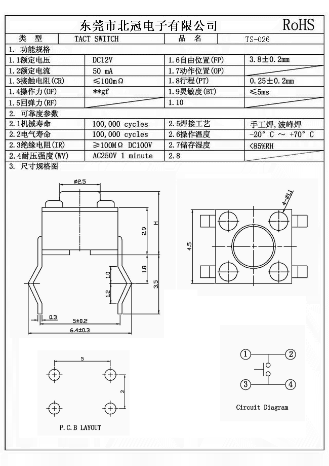產(chǎn)品名稱(chēng):TS-026輕觸開(kāi)關(guān) Typical Specifications |