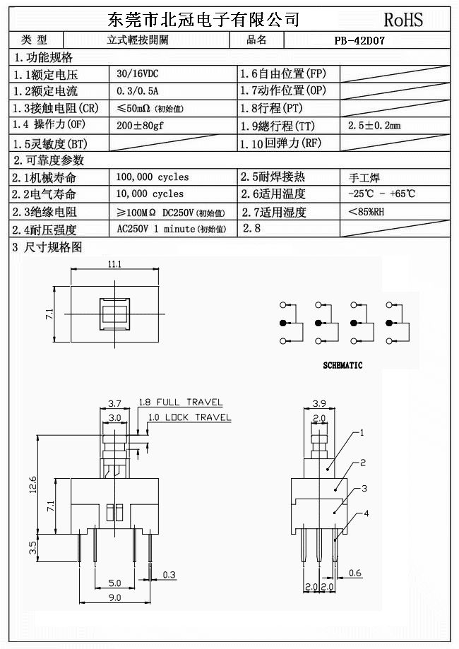 1.Rating : DC 30V 0.1A 2.Contact Resistance: ≤100mΩ 3.Lnsulation Resistance: ≥100mΩ DC500V 4.Operating Temperature Range: -25℃+80℃ 5.Ambient Humidity Used: ≤85%RH 6.Operating Force : 180 ± 50 gf 7.Mechanical Life : 10,000 Cycles 8.Solder Ability:260℃±5℃ 3s