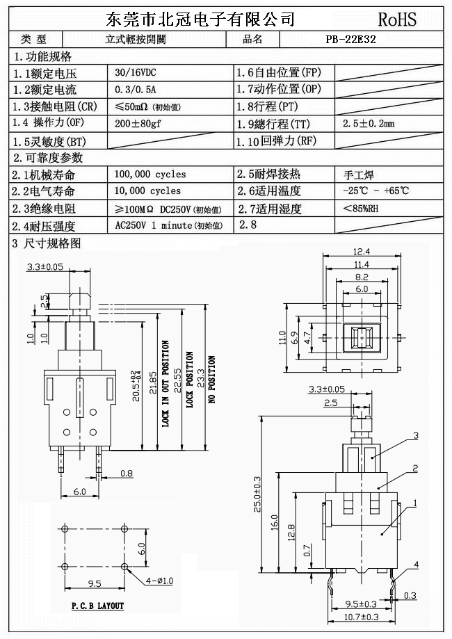 1.Rating : DC 30V 0.1A 2.Contact Resistance: ≤100mΩ 3.Lnsulation Resistance: ≥100mΩ DC500V 4.Operating Temperature Range: -25℃+80℃ 5.Ambient Humidity Used: ≤85%RH 6.Operating Force : 180 ± 50 gf 7.Mechanical Life : 10,000 Cycles 8.Solder Ability:260℃±5℃ 3s
