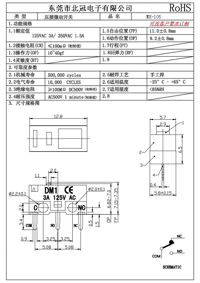 Typical Specifications 1.Rating : DC30V 0.1A 2.Contact Resistance: ≤100mΩ 3.Lnsulation Resistance: ≥100mΩ DC500V 4.Operating Temperature Range: -25℃+85℃ 5.Ambient Humidity Used: ≤85%RH 6.Mechanical Life: 100,000Cycles 7.Operating Force:30±10gf 8.OP:8.8±0.8mm 9.Order: AC 125V 3A