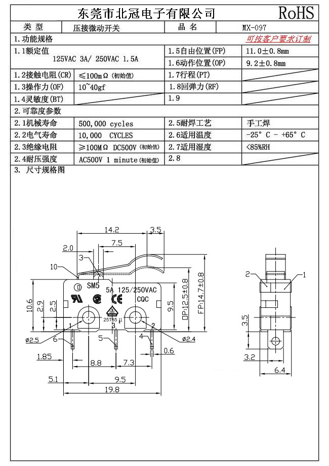 Typical Specifications 1.Rating : DC30V 0.1A 2.Contact Resistance: ≤100mΩ 3.Lnsulation Resistance: ≥100mΩ DC500V 4.Operating Temperature Range: -25℃+85℃ 5.Ambient Humidity Used: ≤85%RH 6.Mechanical Life: 100,000Cycles 7.Operating Force:30±10gf 8.OP:8.8±0.8mm 9.Order: AC 125V 3A