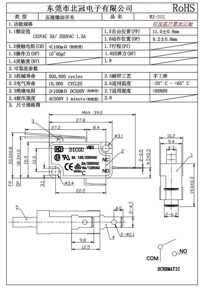 Typical Specifications 1.Rating : DC30V 0.1A 2.Contact Resistance: ≤100mΩ 3.Lnsulation Resistance: ≥100mΩ DC500V 4.Operating Temperature Range: -25℃+85℃ 5.Ambient Humidity Used: ≤85%RH 6.Mechanical Life: 100,000Cycles 7.Operating Force:30±10gf 8.OP:8.8±0.8mm 9.Order: AC 125V 3A
