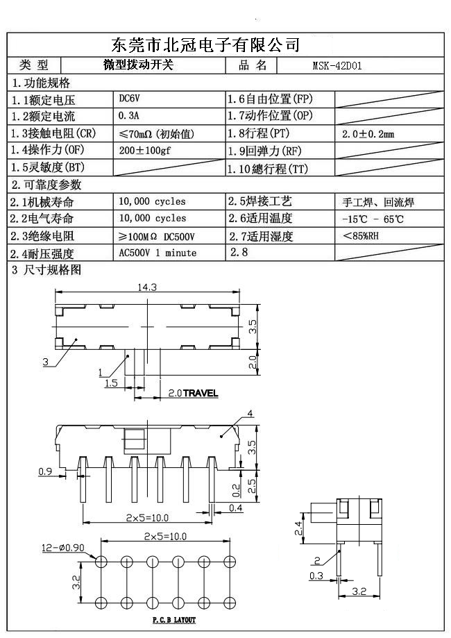 Typical Specifications 1. Rating : DC 12V 50mA 2. Contact Resistance :≤50mΩ 3.Lnsulation Resistance: DC500V 1Minute 4.Operating Temperature Range: -25℃+80℃ 5.Ambient Humidity Used: ≤85%RH 6. Operating Force : 200gf 7. Operating Life : 10,000Cycles