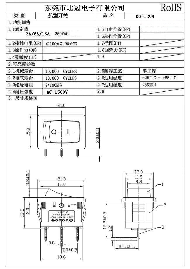 技術(shù)參數(shù)〔SPECIFICATION〕 額定電流、電壓: 6(4)A 250VAC 6A/125A 250VAC 6A 250VAC/10A 125VAC 接觸電阻:≤20mΩ 絕緣電阻:≥100MΩ 介電強(qiáng)度:≥1800VAC/3S 電器壽命:≥10000次