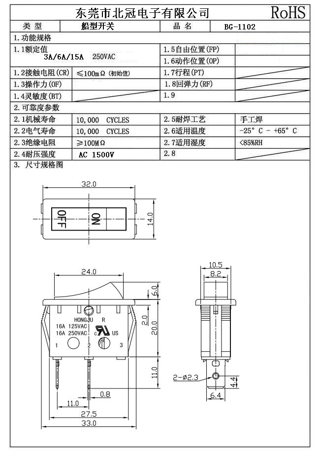 技術(shù)參數(shù)〔SPECIFICATION〕 額定電流、電壓: 6(4)A 250VAC 6A/125A 250VAC 6A 250VAC/10A 125VAC 接觸電阻:≤20mΩ 絕緣電阻:≥100MΩ 介電強度:≥1800VAC/3S 電器壽命:≥10000次